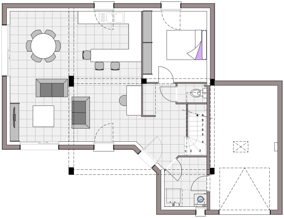 Elle se compose au RDC d'une entrée donnant sur une belle pièce de vie spacieuse, lumineuse et traversante, un wc, une cuisine, un cellier donnant sur le garage et une chambre.