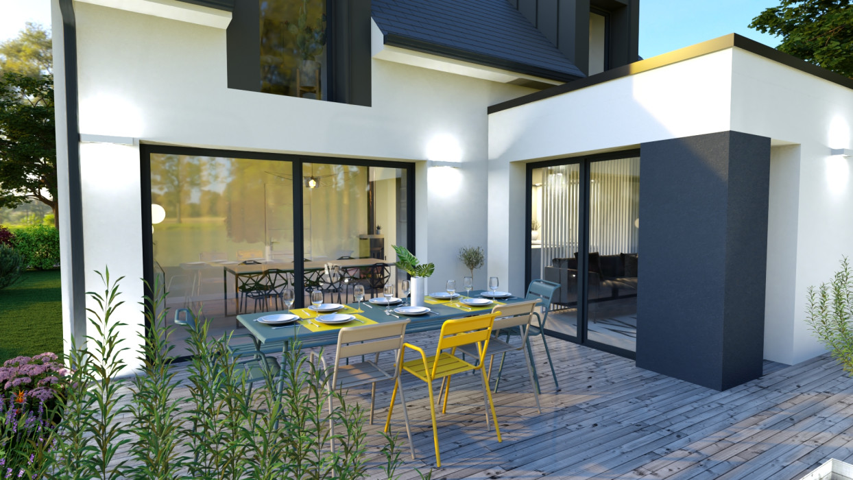 Projet de construction à Bayeux proche des commercesMaison Incluant la norme RE 2020. Maisons France Style constructeur de maisons individuelles sur mesure de qualité en Normandie vous propose cette maison de 121 m² au style alliant tradition et modernité. La maison propose de vastes volumes. Son entrée avec placard intégré donne accès à une grande pièce de vie de 40 m². Ses larges baies vitrées apportent une belle luminosité tout en permettant de profiter au maximum de son extérieur. Une chambre parentale avec salle d’eau est présente au rez-de-chaussée ainsi qu’un wc séparé. À l’étage la maison dispose de 3 chambres, d’une salle de Bain et d’un wc séparé. Un garage de 16 m² et un cellier vous permettront de disposer d’espaces de rangements et de stockage supplémentaire. L'aspect extérieur de la maison peut être agrémenté de bardages en zinc, bois ou composites. Nous réalisons nos maisons avec des artisans et des matériaux de qualité. Nos maisons sont modifiables et personnalisables afin de répondre à vos habitudes de vie et attentes mais aussi aux spécificités de votre terrain. Afin que nous puissions étudier votre projet contactez Hugo