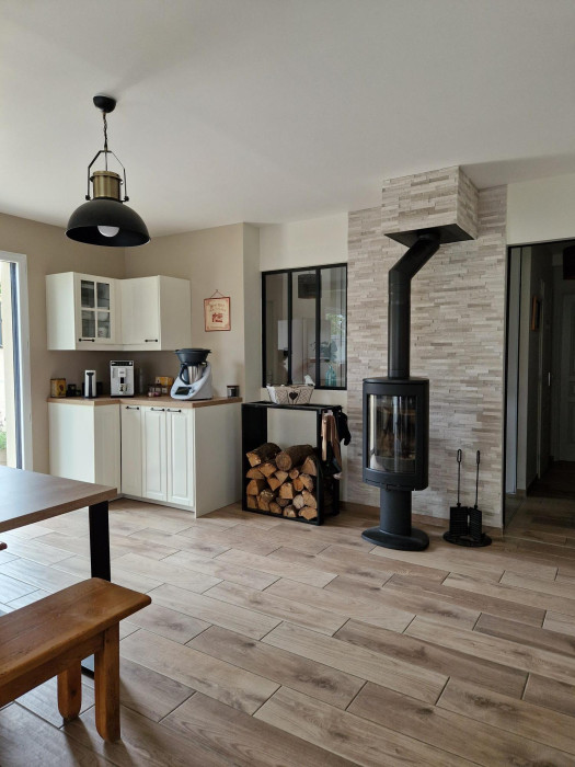 Grand espace de vie éclairée par de grandes bais vitrées, cuisine ouverte, chauffage au sol.