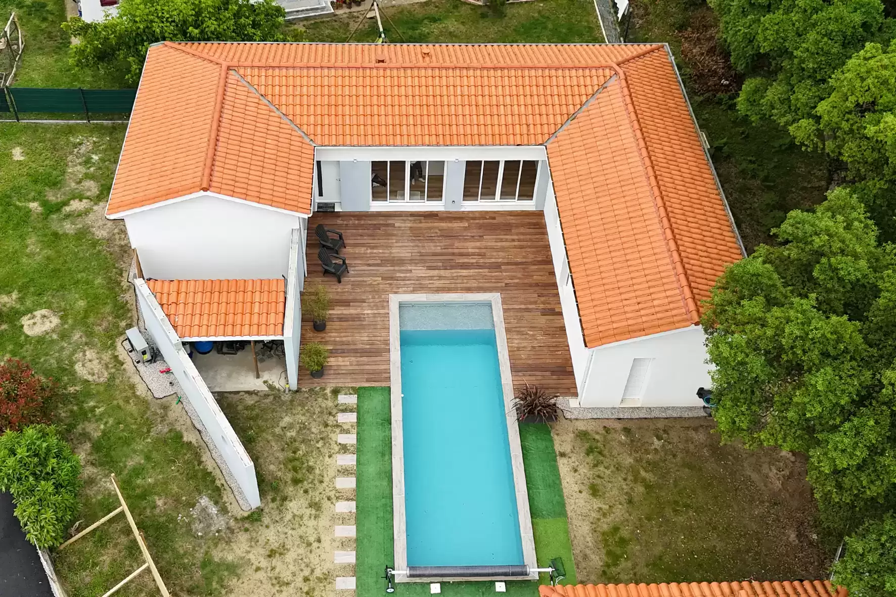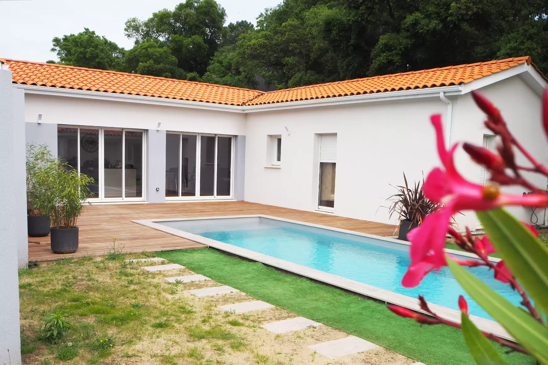 Découvrez cette magnifique maison neuve individuelle de plain-pied en U, pensée pour s’ouvrir entièrement sur une piscine tout en longueur. Réalisée à Tarnos, dans le sud-ouest de la France, cette maison unique a été conçue et construite par l’agence Maisons France STYLE de Mimizan.